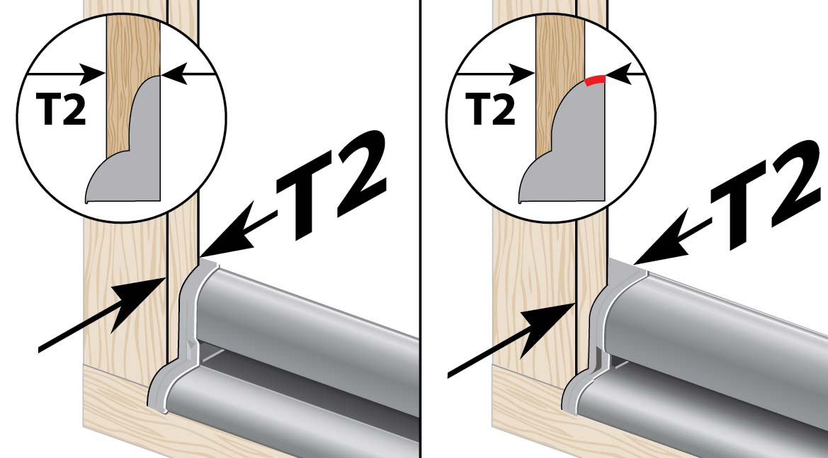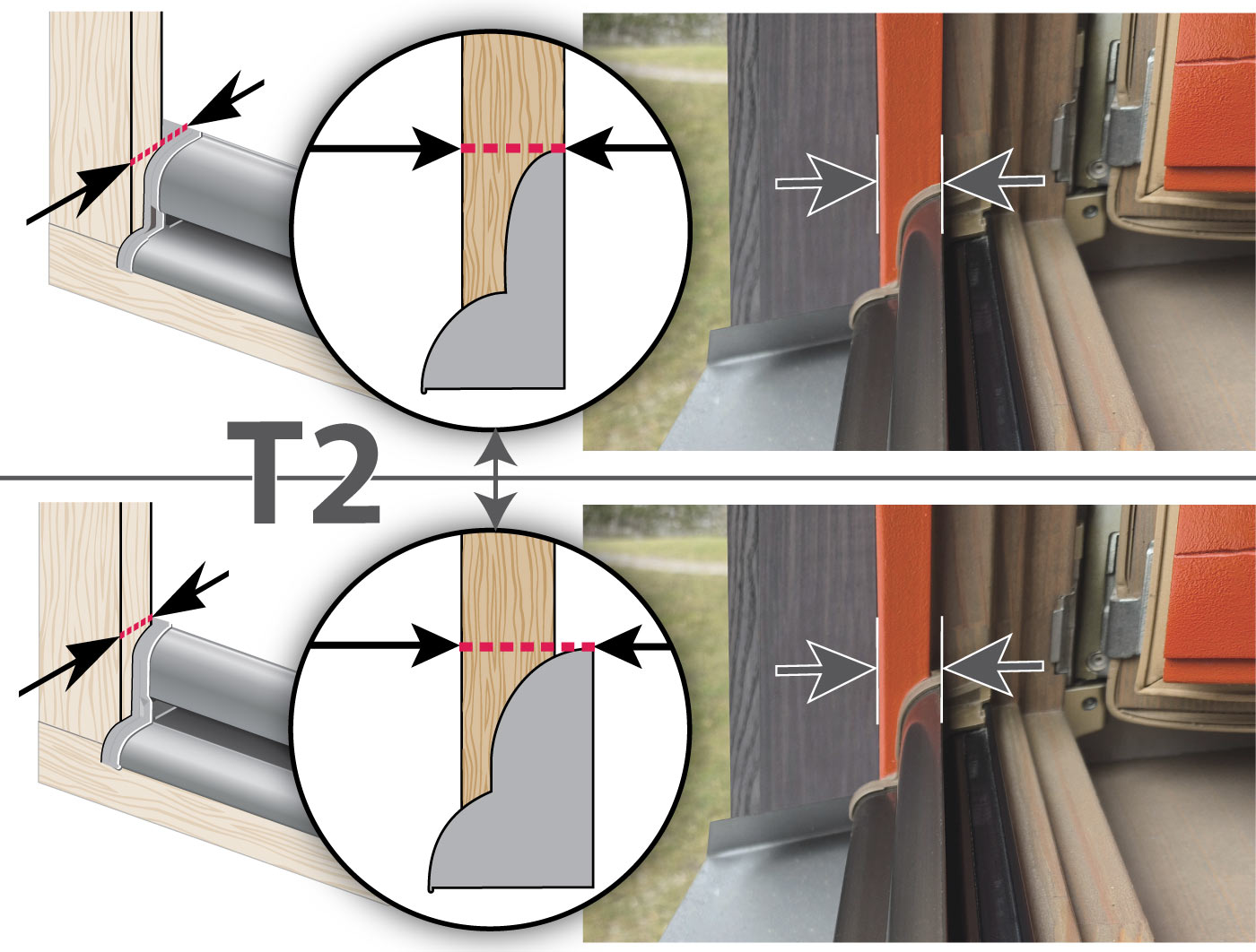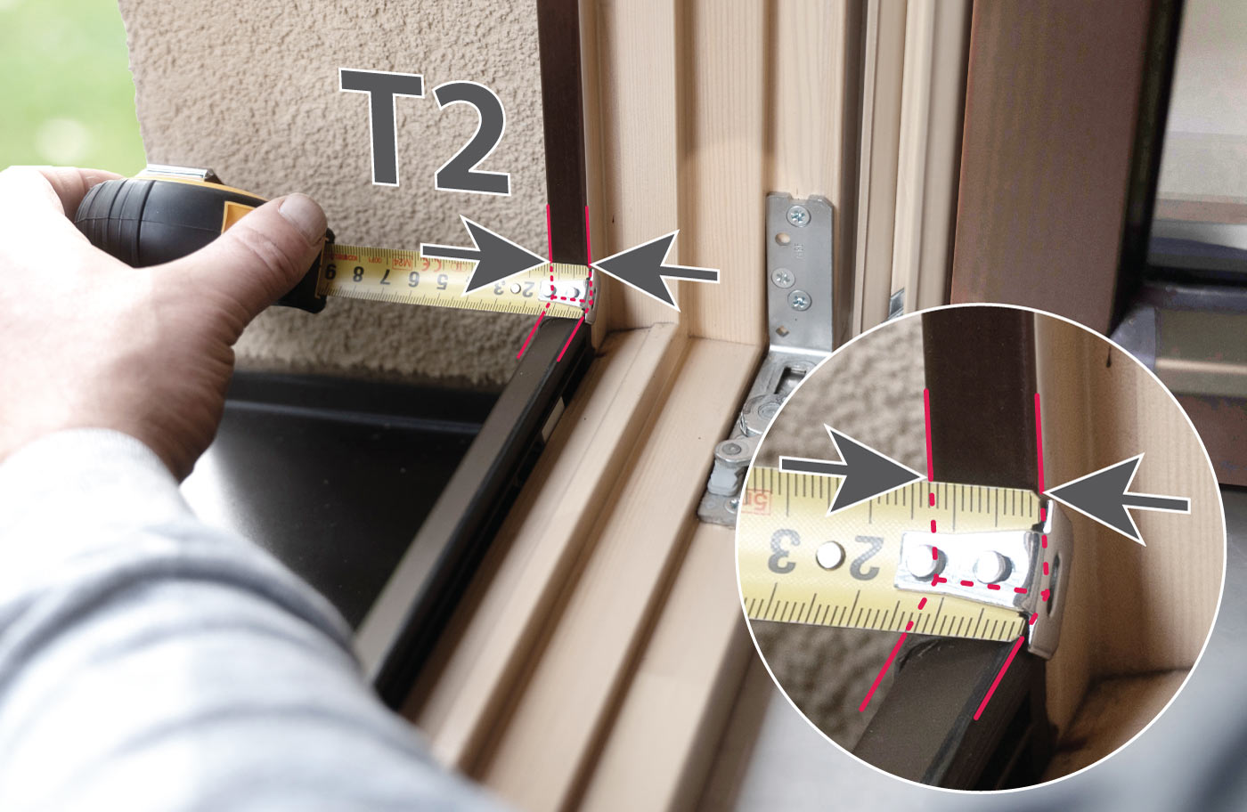 - Wenn eine Tropfkante oder ein Metallprofil über die Rahmenfläche hinausragt, muss dies in das T2-Maß einbezogen werden (siehe rote Linie in der Abbildung).