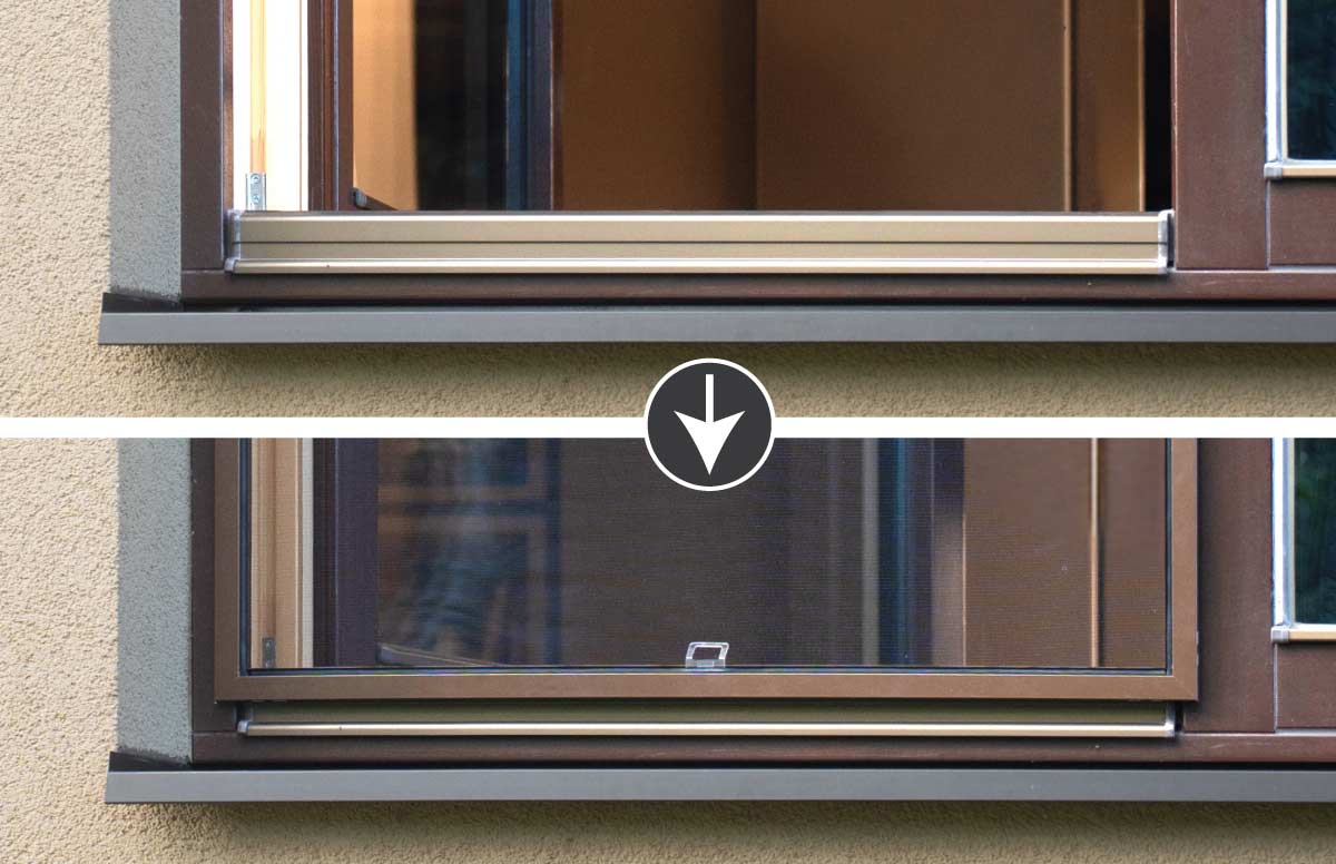 Maßgefertigter Insektenschutz für Holzfenster mit nach innen klappbarer Aluminiumabdeckung. Der Rahmen des Insektenschutzes besteht aus einem dicken Aluminiumprofil mit Metall-Eckverbindern – stabil, langlebig und ästhetisch ansprechend. Die Bürste um den Rahmen des Insektenschutzes dichtet selbst kleinste Lücken ab und schützt die Fensteroberfläche vor Kratzern und Windschäden. Montage und Demontage ohne Werkzeug. Unsichtbar bei geschlossenem Fenster. Erhältlich in verschiedenen Rahmenfarben und Gewebetypen.