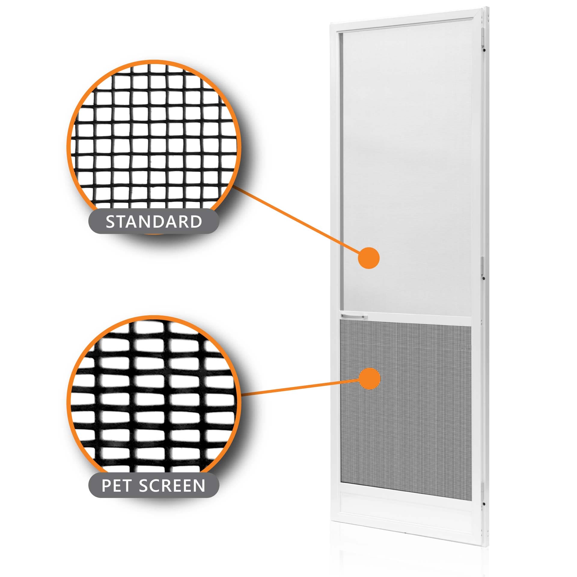 A swing insect screen door is shown, with a close-up circle highlighting two green dots on the mesh area.
