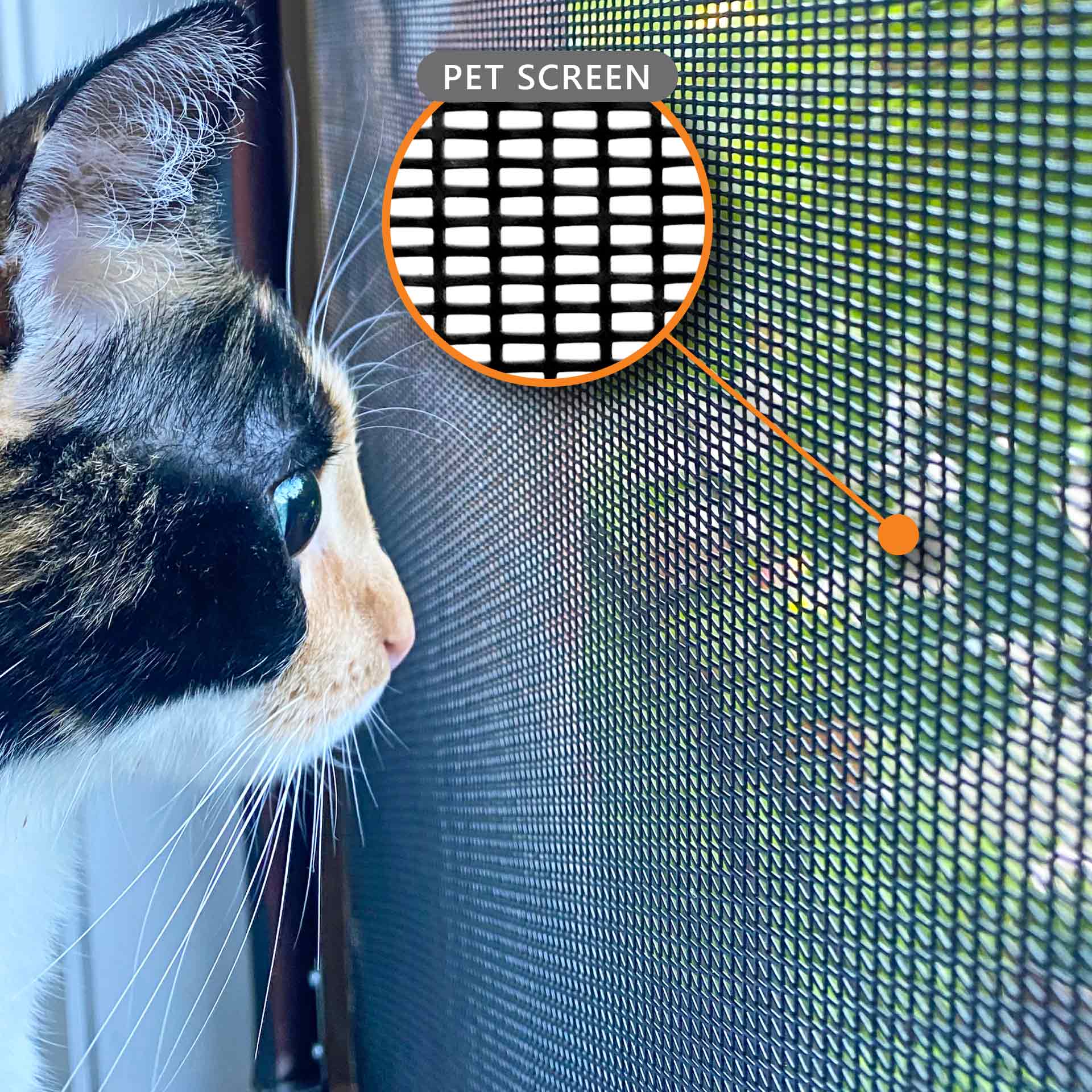 The mesh, made from extra-strong material, is approximately 7 times more durable than standard fiberglass mesh and provides protection against pet scratches. The mesh hole size is 1.49 × 2.54 mm. With 40% transparency this mesh is more visible and safe for pets. Not only will the pet screen material prevent a pet from escaping, the mesh will also protect your home from outside intruders: insects, birds, rodent, and reptiles.